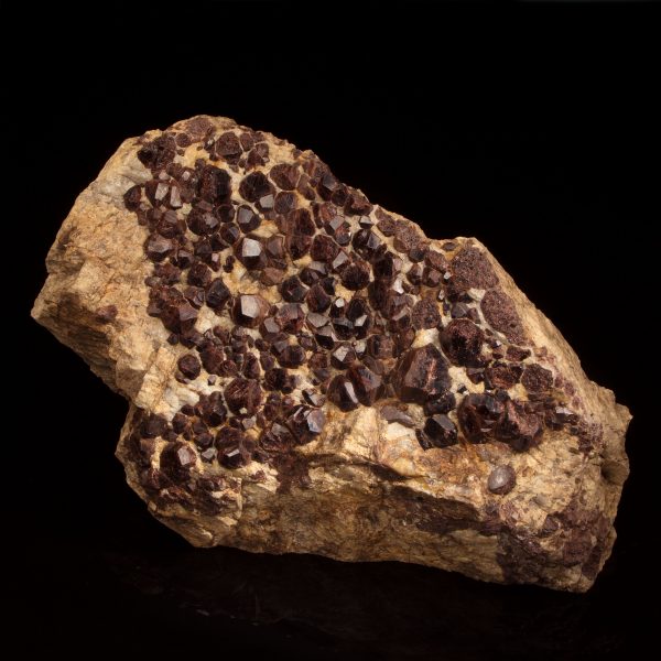 The most common species found in granitic pegmatites are iron-rich almandine and manganese-rich spessartine. Almandine is typically red, reddish-brown, or reddish-purple, while spessartine reddish-orange to orange. Almandine is far more common than spessartine.