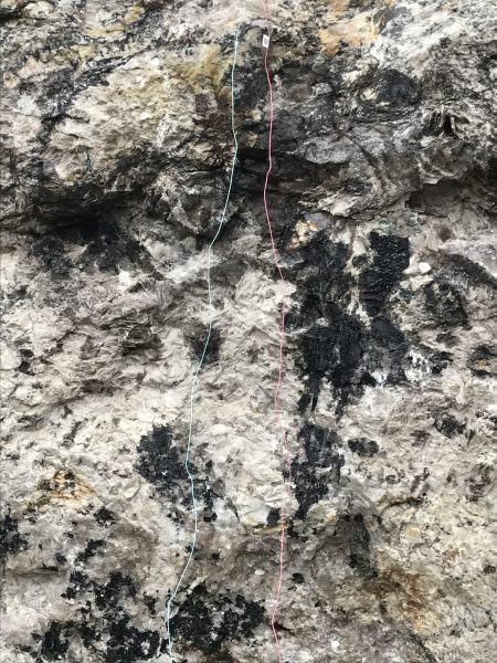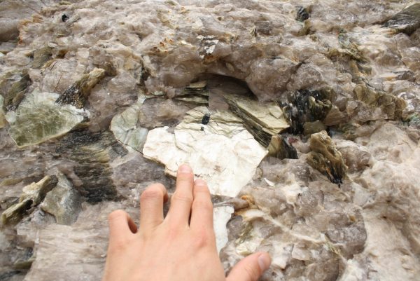 The pegmatite (white) extends from left to right in the image. Above it is the brown, rusty-colored rock it intruded, simply called “country rock”.