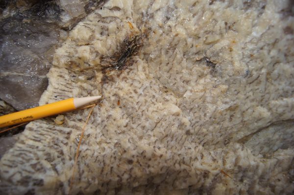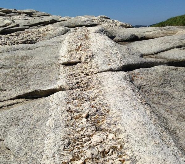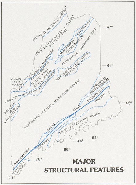 Note the layers in the metamorphic rocks surrounding the pegmatite. The layers were not always folded. They were originally flat but were compressed and contorted by surrounding tectonic forces. These forces produced the folds seen in the rock. The majority of Maine’s bedrock is metamorphic and those rocks are commonly folded, though the scale of the folds varies.