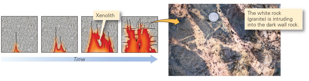 Without knowing the exact time that this all happened, geologists have established that metamorphic rocks formed first, then were later intruded by the pegmatite melt, a separate event.