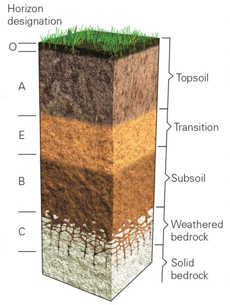 As soil develops it forms layers called soil horizons from topsoil to subsoil down to bedrock.