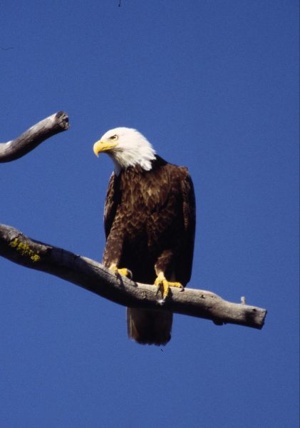 Physical Description: Dark brown feathers for the body and wings, white feathers for head of mature bird (3rd year), neck, and tail; yellow beak and feet