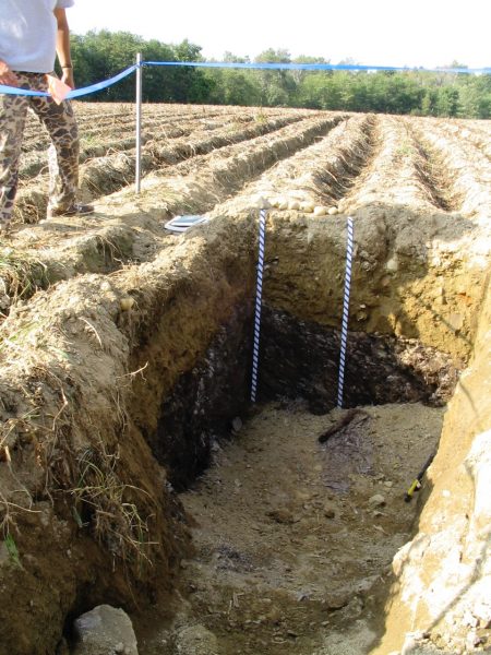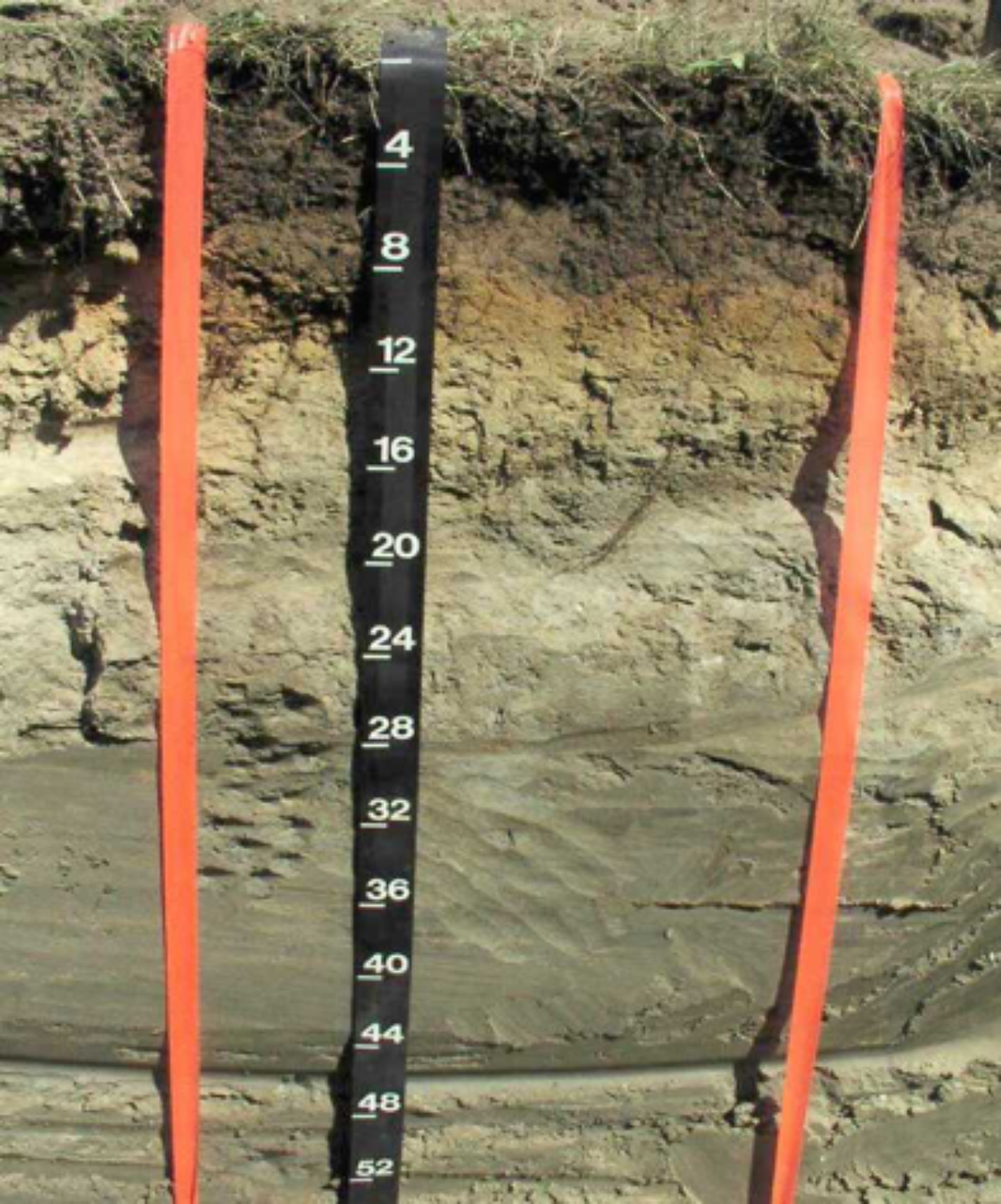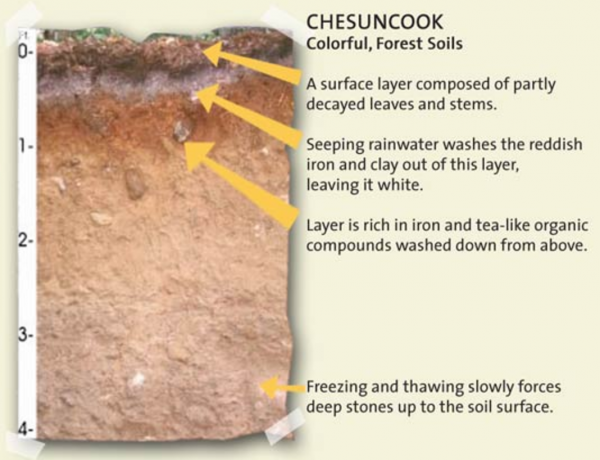 Texture and slope of the landscape together determine how well the soil is drained. Due to oxygen in soil, well-drained soil is orange and bright from iron oxide. In contrast, poorly-drained soil at or below the water table is dull or gray.