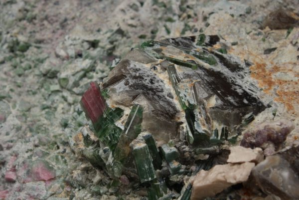 Finding pockets in pegmatites is an acquired skill. Miners commonly use the presence of specific minerals, “indicator minerals,” as a means to detect the pockets.