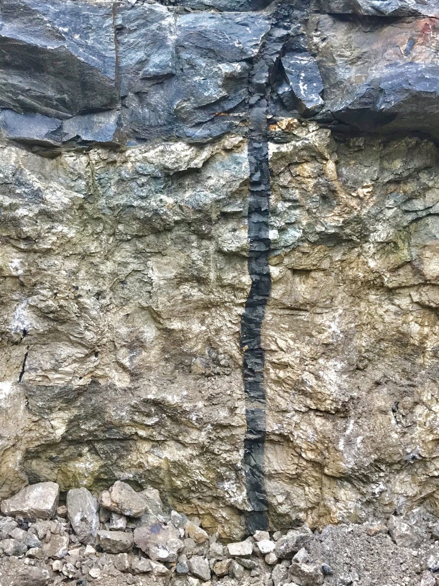 Basaltic dike (vertical), cross-cutting pegmatite (white, below) and metamorphic rock (dark, above). Haye Quarry, Poland, ME