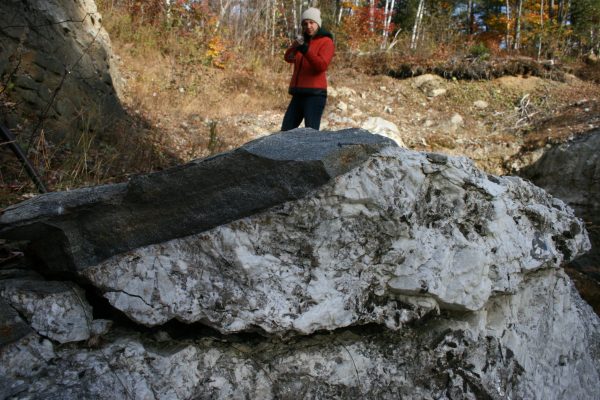 Pegmatite (white) and metamorphic rock (dark) contact. Mt. Apatite, Auburn, ME