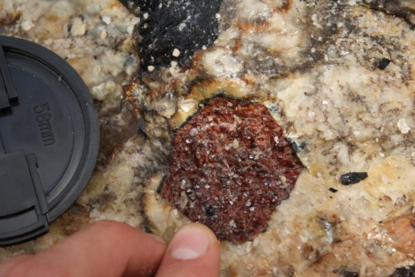 Almandine is a common accessory mineral in Maine’s pegmatites. At several well-known gem/specimen mines almandine garnet is used by miners as an guide to detect where pockets may be located. The garnets are aligned, creating a layer referred to as the “garnet line”. In some pegmatites, the garnets have a rim of black-blue tourmaline, an indicator that a pocket may be close.