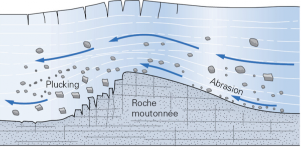 Note the gradual slope on the left and a steep slope on the right. This shape developed as a glacier moved over the top of the mountain. As the flowing glacier rode over the left side of the mountain, it ground down on the bedrock creating a gentle slope. As it continued moving over the right end of the mountain, it began removing, “plucking”, bedrock creating a steep cliff face.