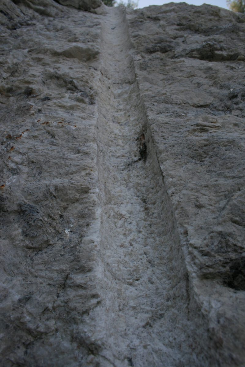 The pegmatite (white) extends from left to right in the image. Above it is the brown, rusty-colored rock it intruded, simply called “country rock”.