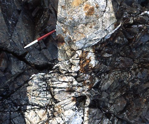 Basaltic dike (vertical), cross-cutting pegmatite (white, below) and metamorphic rock (dark, above). Haye Quarry, Poland, ME